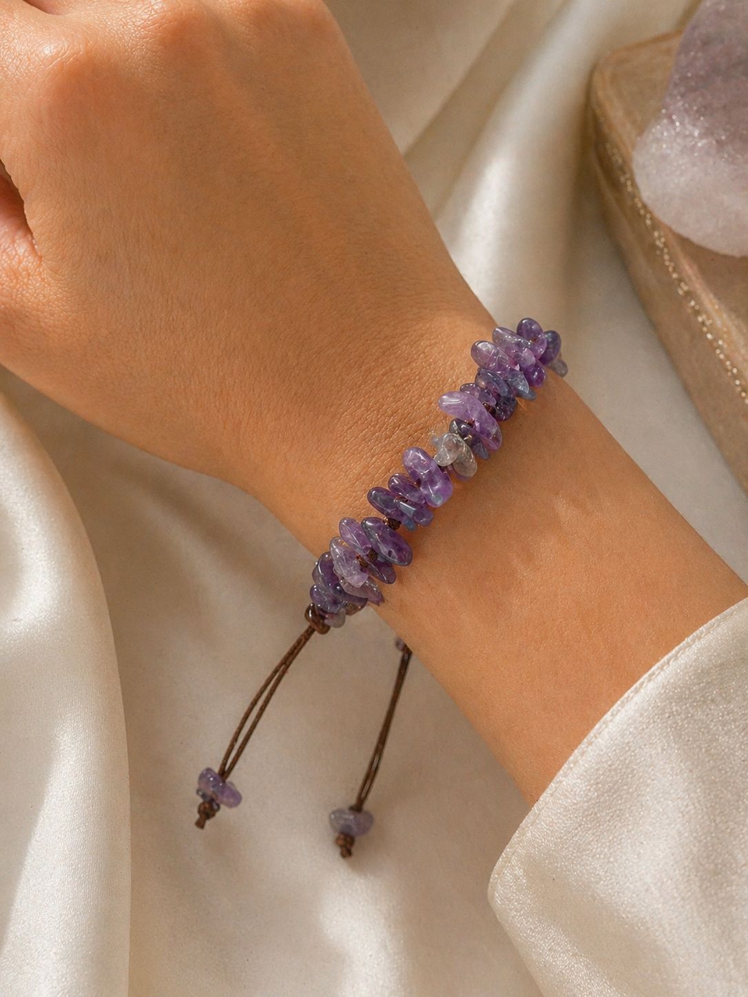 Esta pulseira ajustável combina o charme natural das pedras com um design delicado e confortável, ideal para usar diariamente ou em momentos especiais. A tonalidade roxa da ametista transmite calma e sofisticação, tornando esta peça única e cheia de significado.